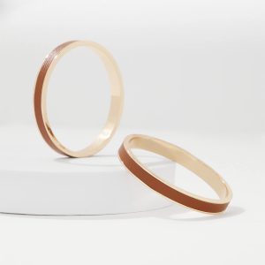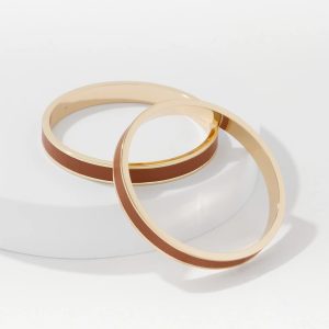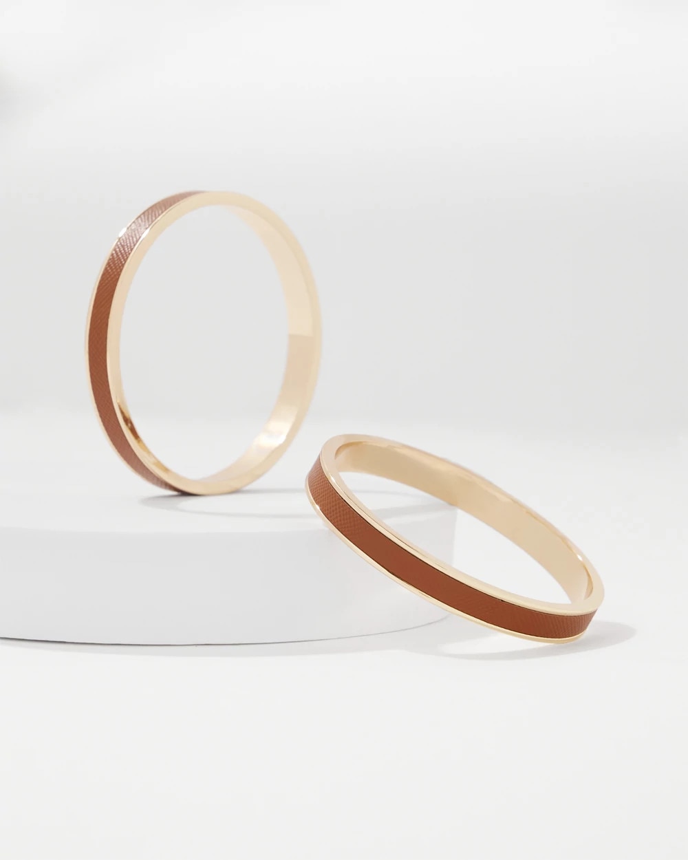The brown saffiano leather inlaid in gold metal is what sets this pair of textured leather bangles apart. Wear them together or one at a time. Pair with other pieces from our Textured Inlay Collection.