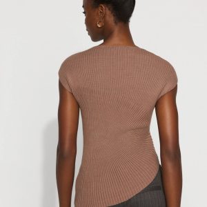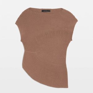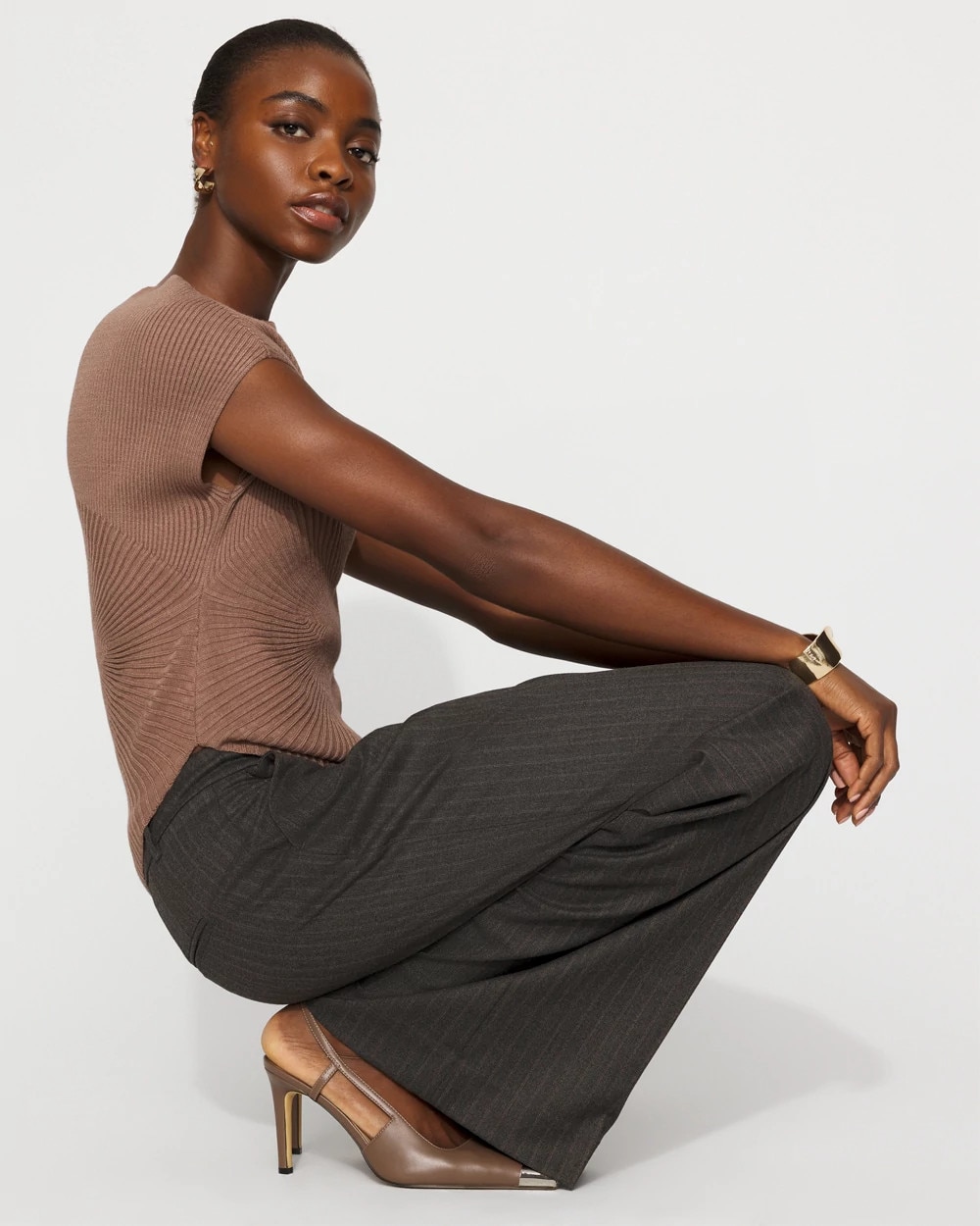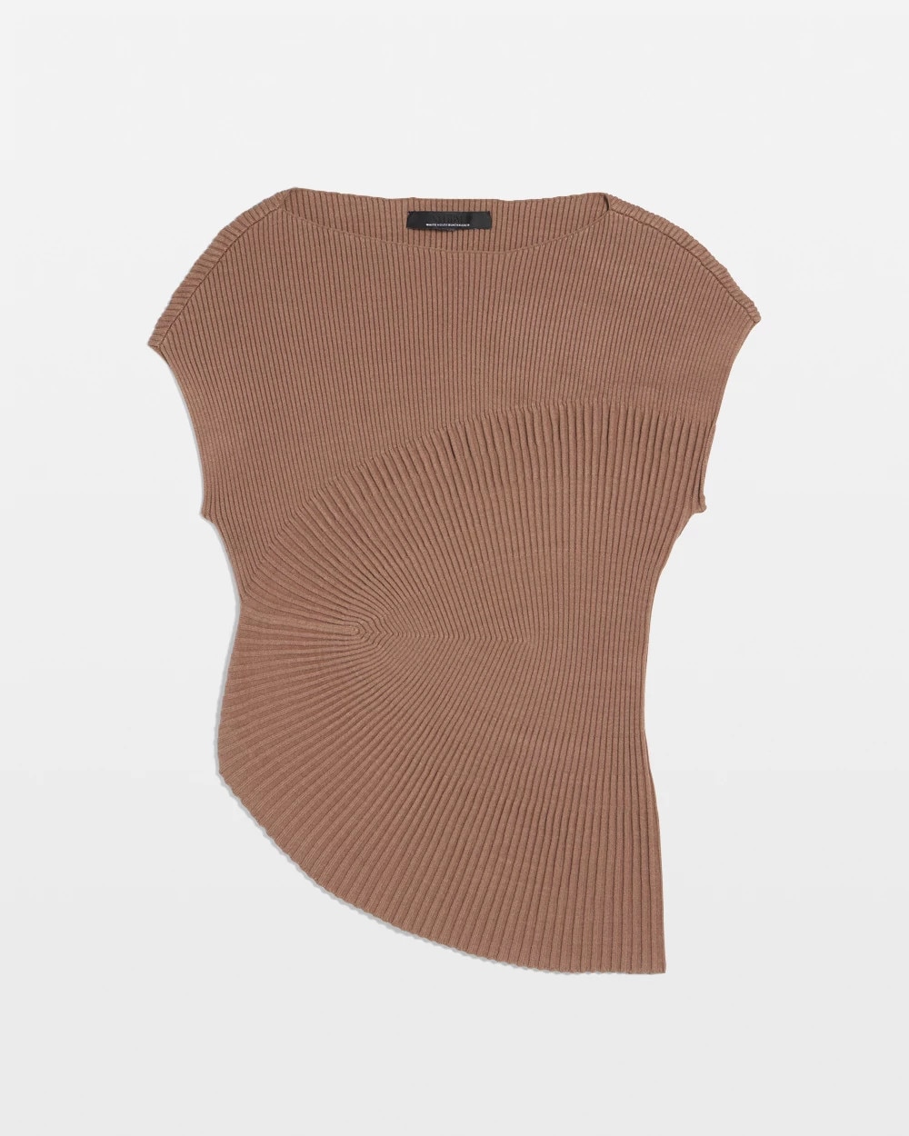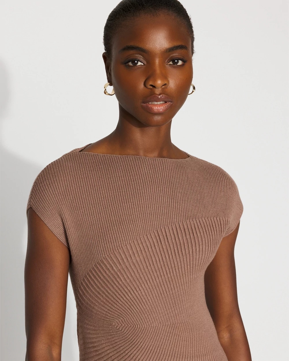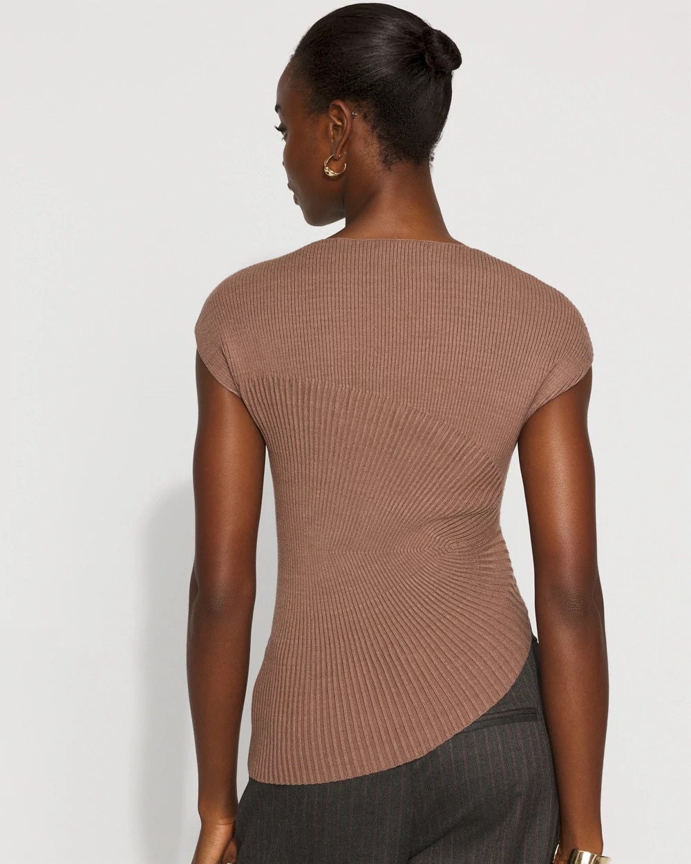 The radiating rib pattern creates a cinched look at the waist to shape you, while the asymmetric hem elevates the look further. Short cap sleeves and a mock neck are further modern design details.