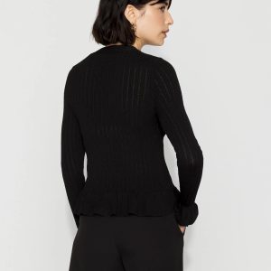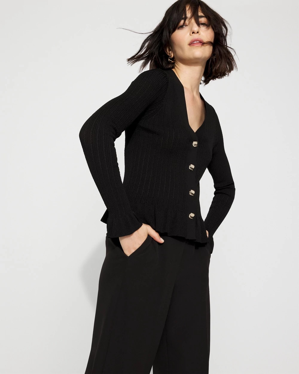 Need a dressy layer for work or weekends? This pointelle knit cardi is designed with flowy bell sleeves and a feminine peplum to give you shape. We’ve added sculptural soft gold buttons to further elevate this classic cardigan. Wear it over dresses and tees or on its own.