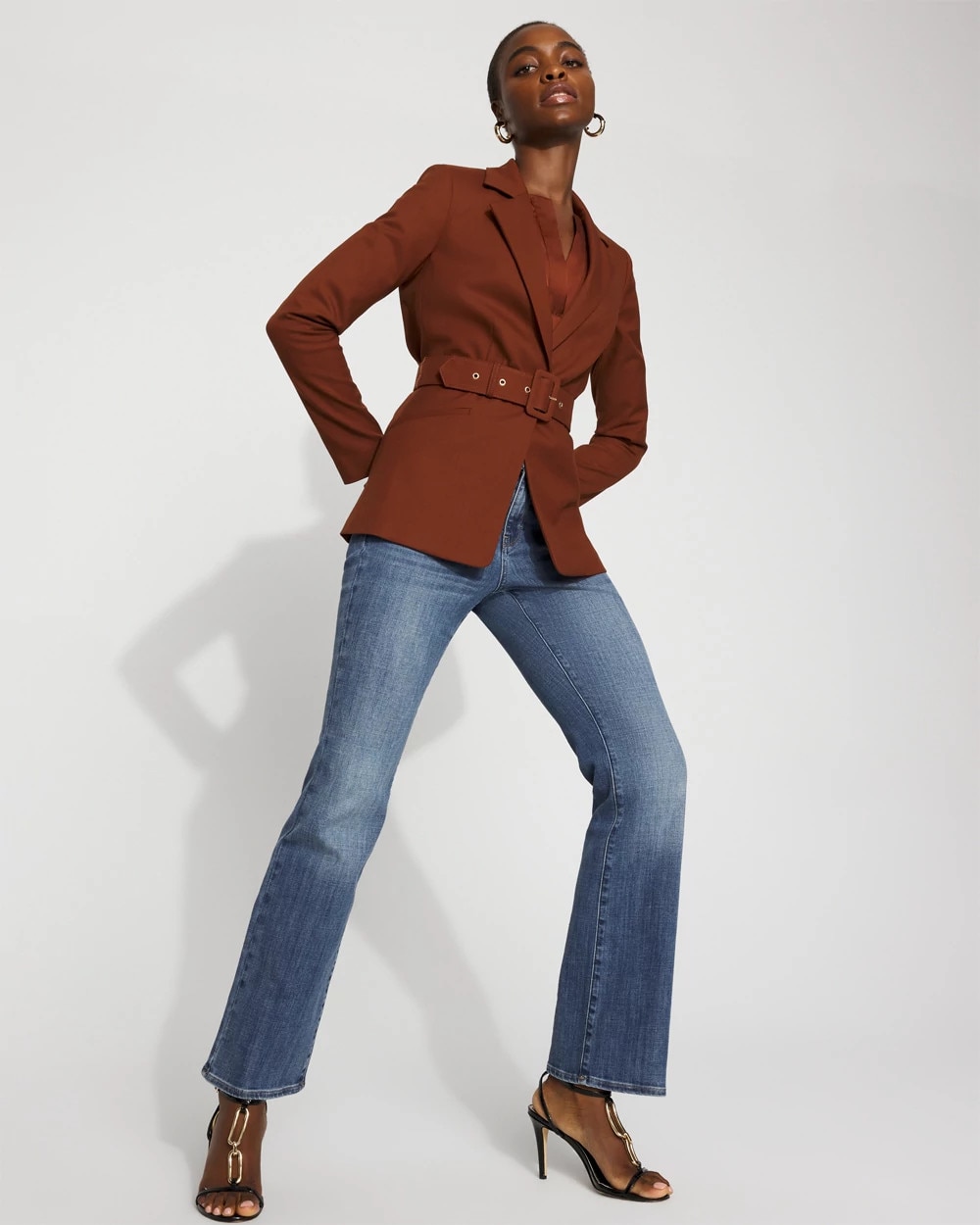 A self-belt gives shape to this classic blazer. The jacket is designed with a snap closure and pockets and the belt is removable. Pair it with our matching Blake Mariner Slim Boot Pant.