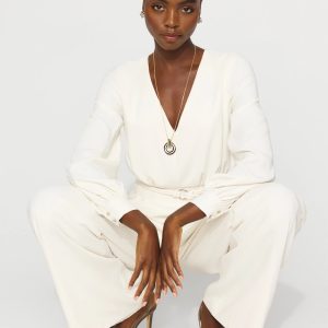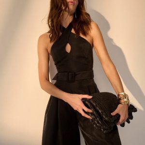 Your favorite halter top in jumpsuit form. Designed with a wide-leg pleated pant silhouette, this jumpsuit is made from a lightweight twill fabric. The crossover halter top has a keyhole front. The self-covered belt and belt buckle finish the look.