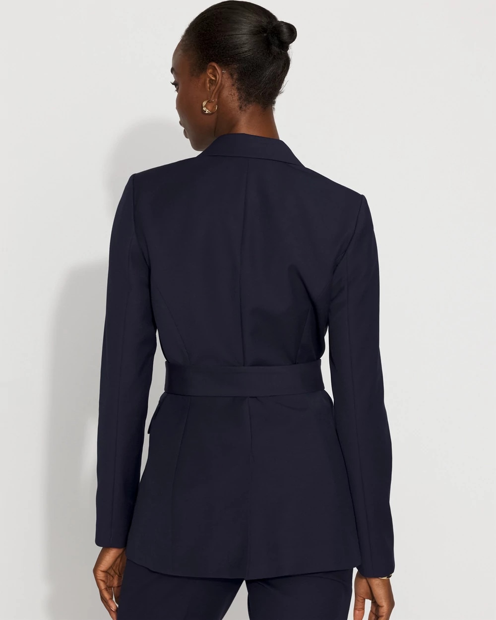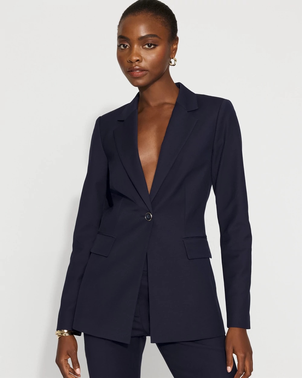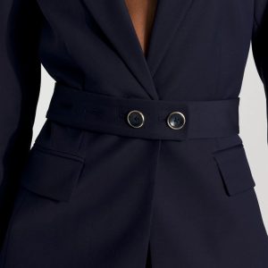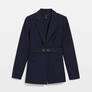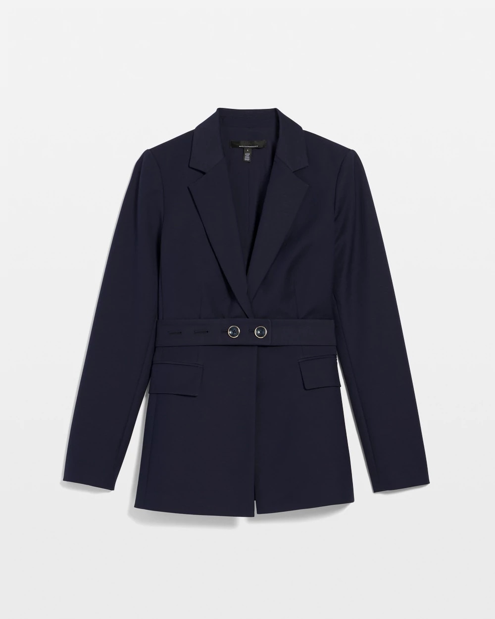We added a waist belt with two matching navy buttons rimmed in gold to our bestselling one-button blazer for a feminine silhouette. The belt is removable, but we think you’ll want to keep this one in place. Crafted from our bestselling comfort stretch fabric, you can pair it back to any of our pants in the franchise.