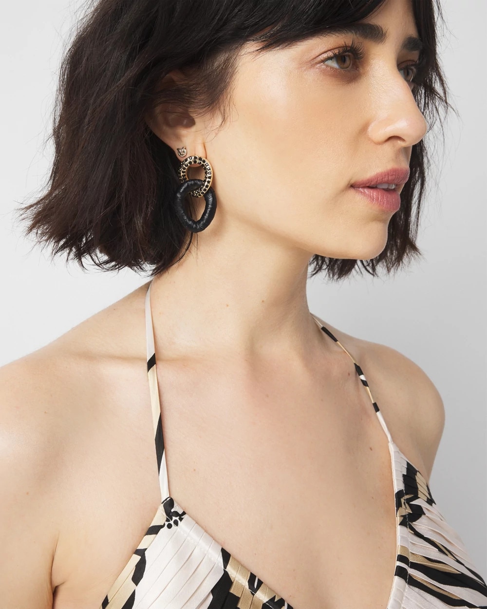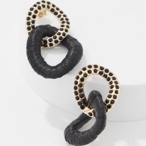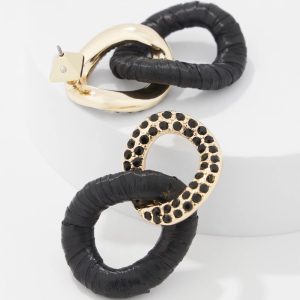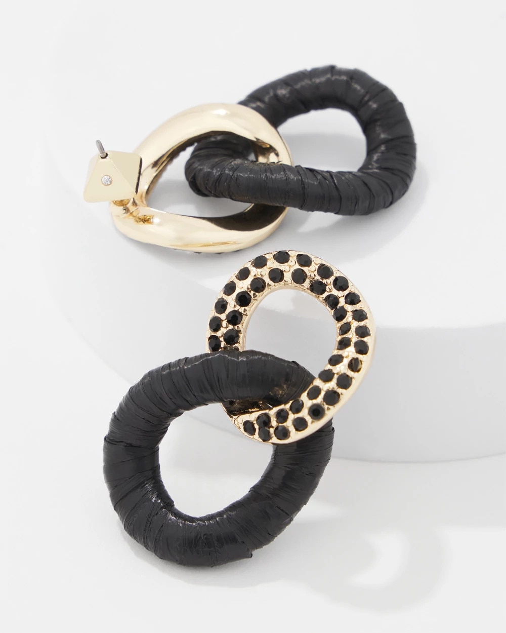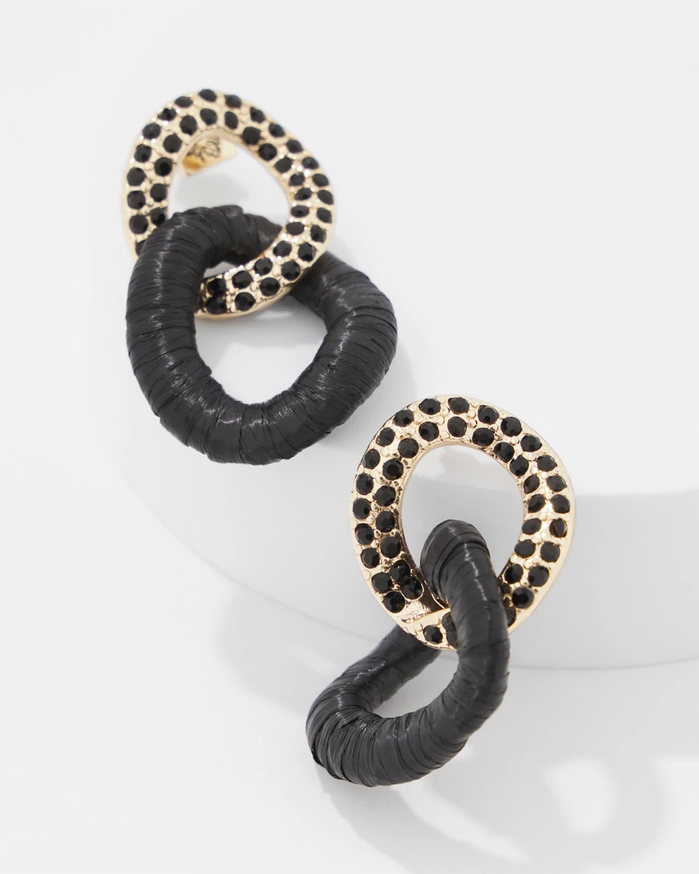 A dramatic black raffia wrapped link is intertwined with a gold link embellished with black crystals to create these statement earrings.