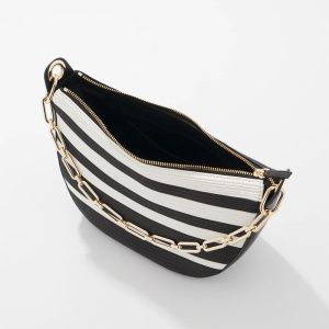 Variegated stripes in contrasting black + white faux leather make this shoulder bag pop. We’ve added a novelty chain strap that adds a touch of shine. The flip side of the bag is solid black. Mix and match it with other pieces in our Black + White Cording Collection including a belt and shoe.