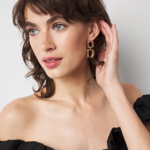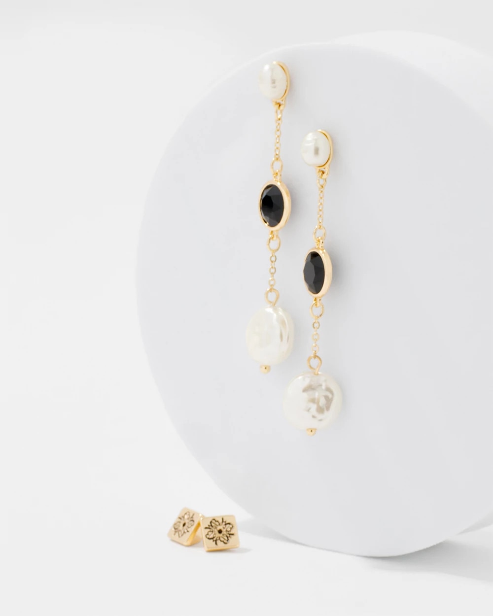 A single black crystal hangs midway down the length of these linear earrings, which are finished with a single large teardrop faux pearl. Elegant and modern, these will add instant polish to your look.