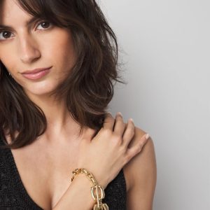 Three strands of faux pearls and black crystal stones create this elevated bracelet. Mix and match with our pieces in the Baroque Pearl Collection.