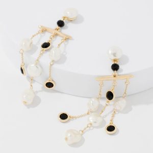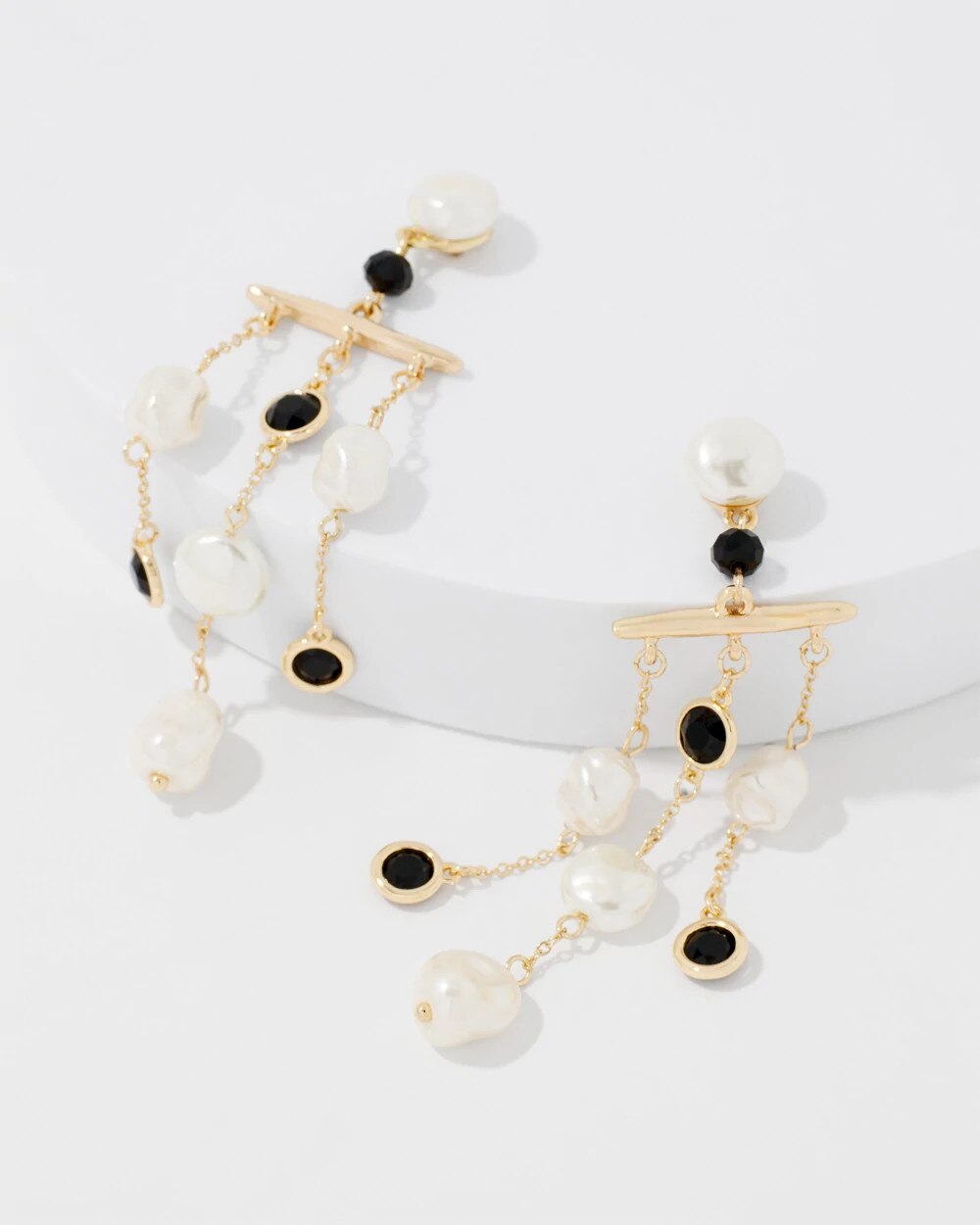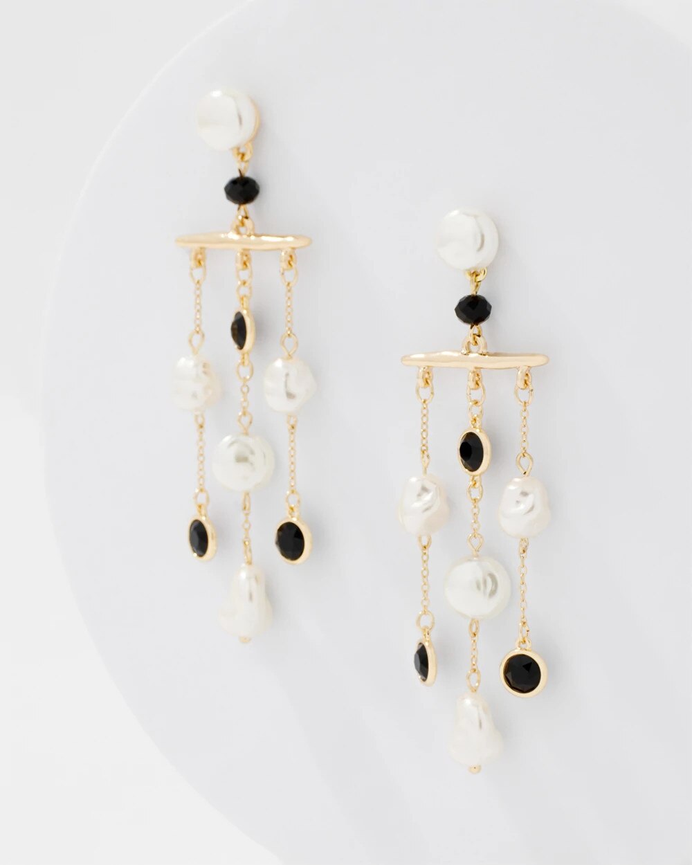 Three strands with faux pearls and crystal stones make up these dramatic earrings. The post is also adorned with a single pearl and black crystal for a striking contrast.