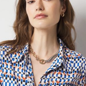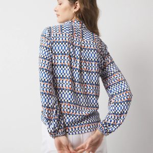 This blouse is made from a geometric scarf print and has a front button placket, collar and elastic cuffs so you can zhuzh them up to a full blouson effect. We’ve also added a tie-waist for more styling options.
