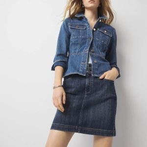 A double row of braided denim at the waistline refreshes this classic jean skirt design. Wear it with any of your favorite summer tees and tops.