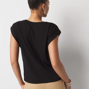 This easy summer tee has soft shirring on the shoulder with braided trim. A relaxed look that is perfect to pair with denim or shorts.