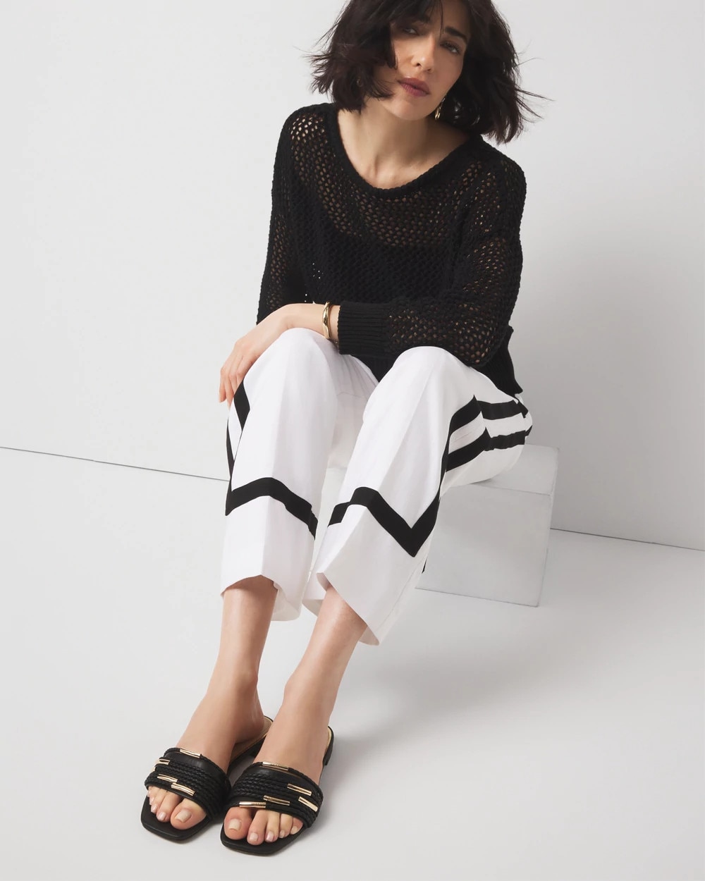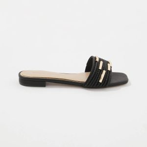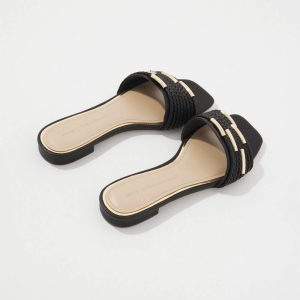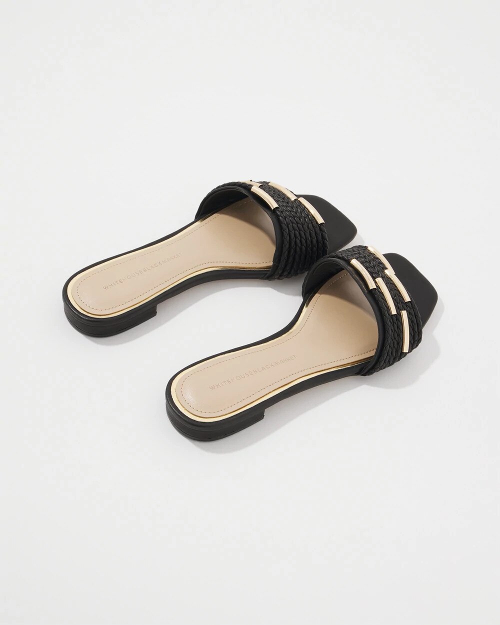 Slide into these summer flats designed with a wide band decorated with multiple braided straps and gold hardware. An easy style of shoe that will go with any outfit.