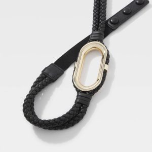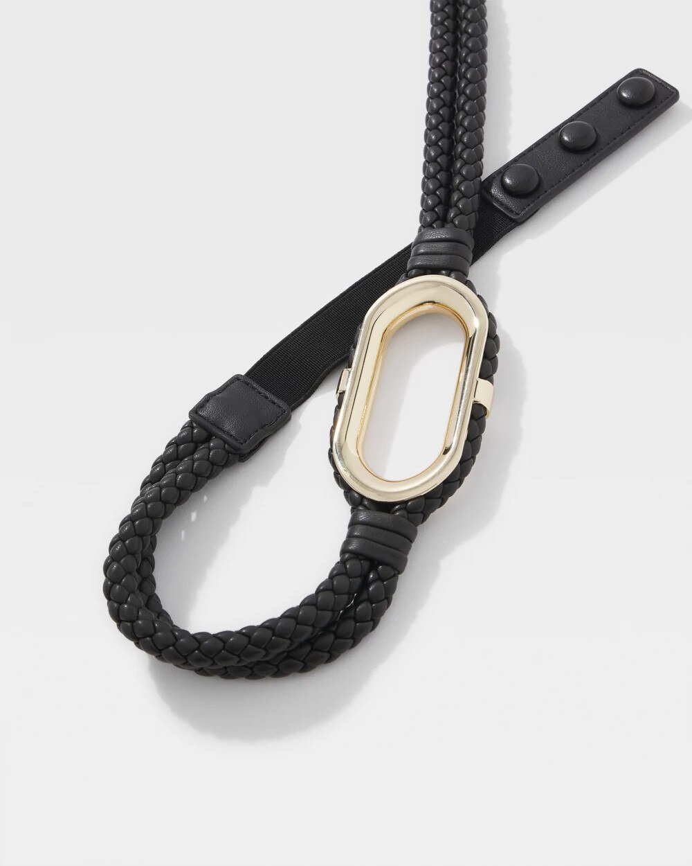 This stretch waist belt is made from braided faux leather and has a shiny gold hardware design at the front. An easy and stylish way to elevate your dresses.