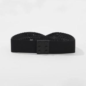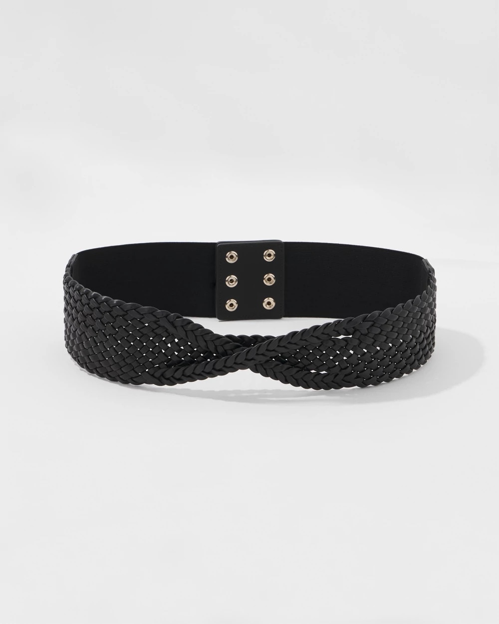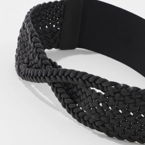 Intricate braiding details form a twist in the center front of this wide waist belt. It has stretch and a snap closure making it easy to wear and a perfect look for dresses.