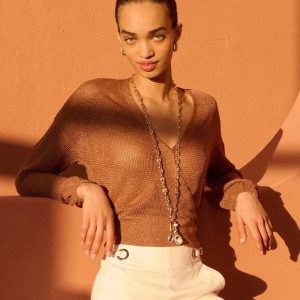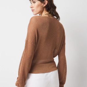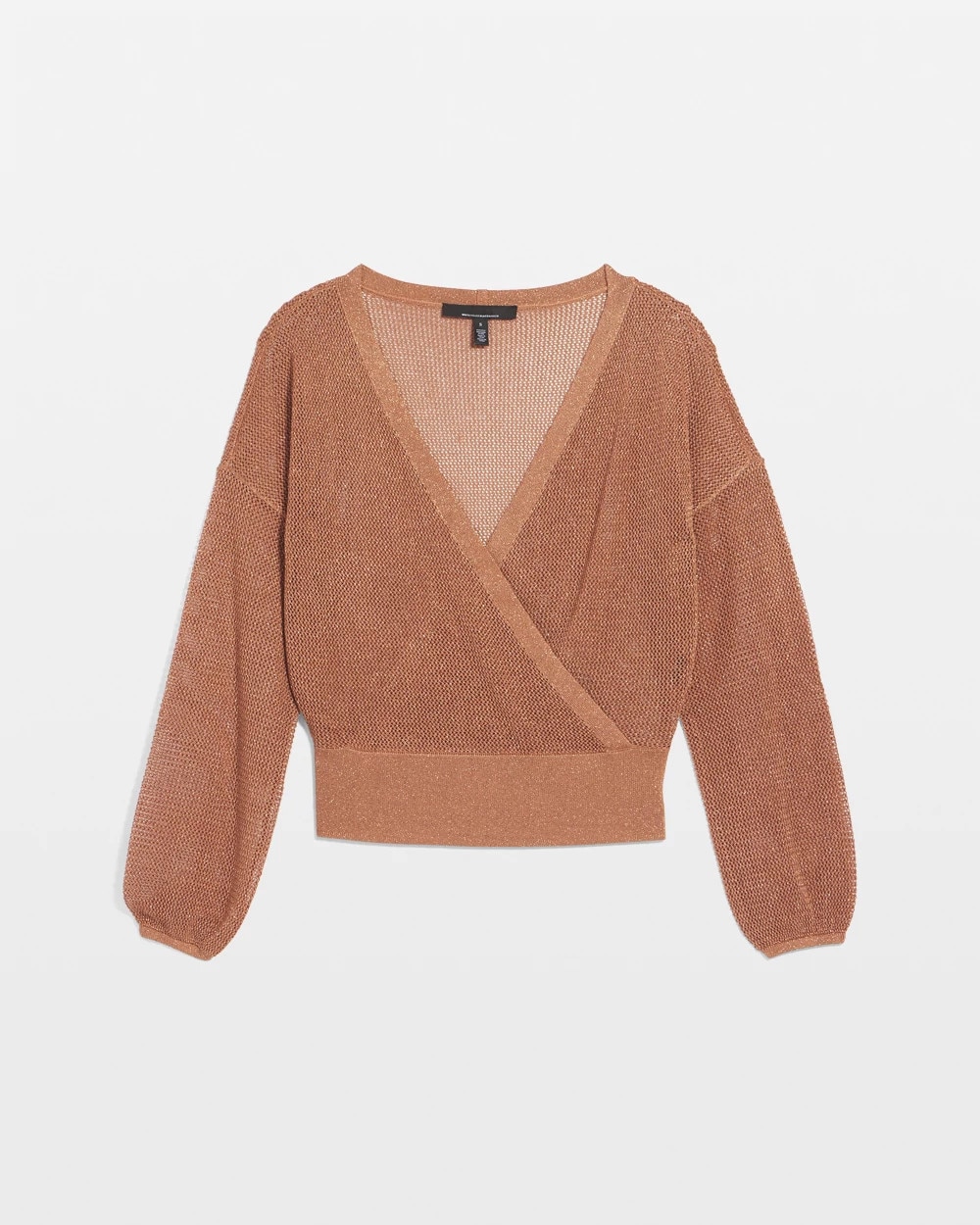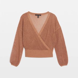 Blouson sleeves with ribbed cuffs and a banded bottom elevate this open stitch surplice sweater. But it’s the copper metallic shimmer from the lurex yarn that sets it apart.
