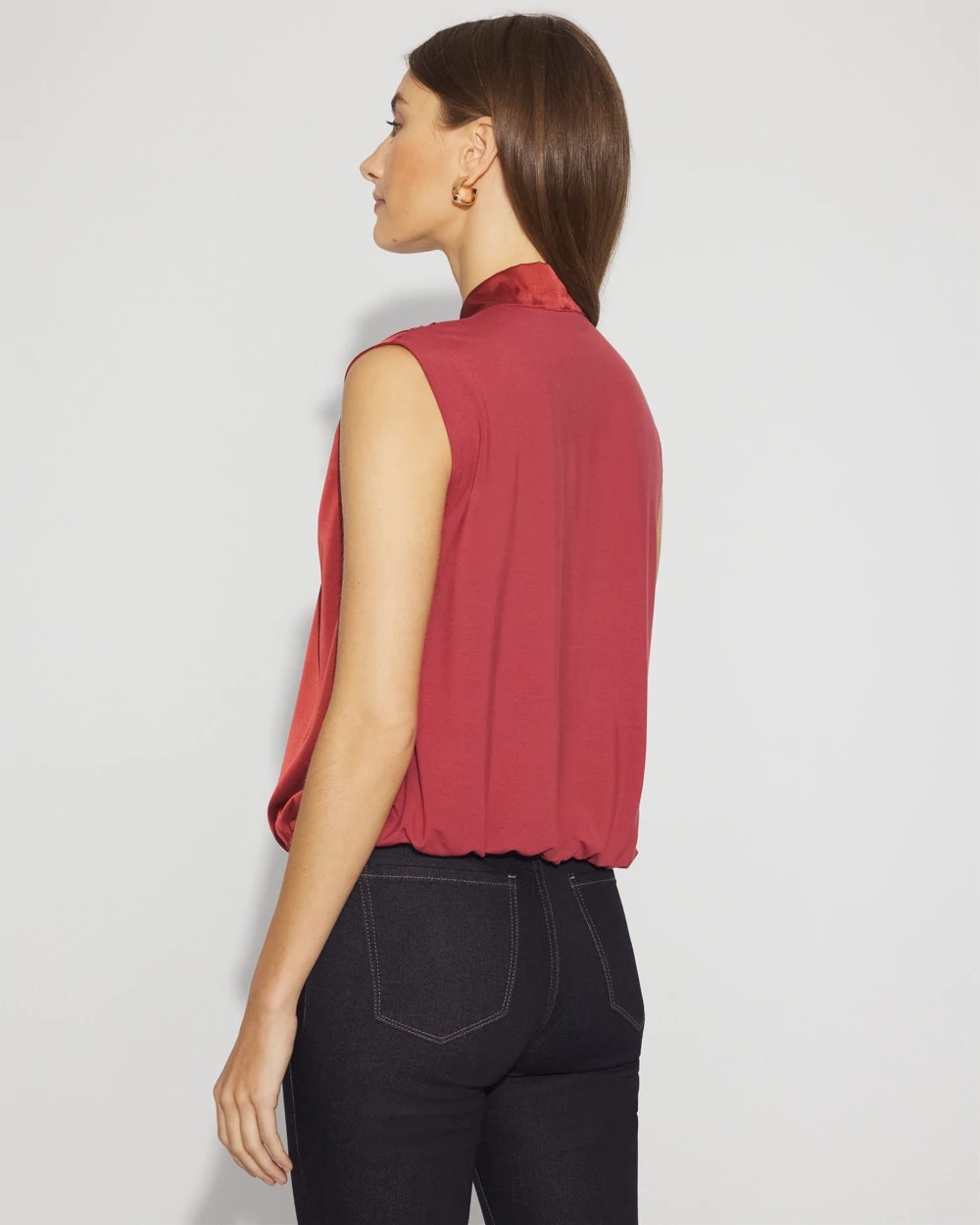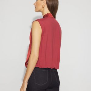 This stylish shell will quickly become a workwear favorite. Designed with soft shirring at the shoulders, it has a gathered hem to create a “bubble” silhouette. The ties at the neckline give you styling options. Layer under a blazer and pair with your favorite black pant.