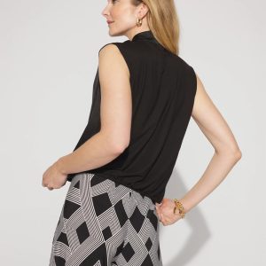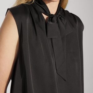 This stylish shell will quickly become a workwear favorite. Designed with soft shirring at the shoulders, it has a gathered hem to create a “bubble” silhouette. The ties at the neckline give you styling options. Layer under a blazer and pair with your favorite black pant.
