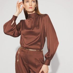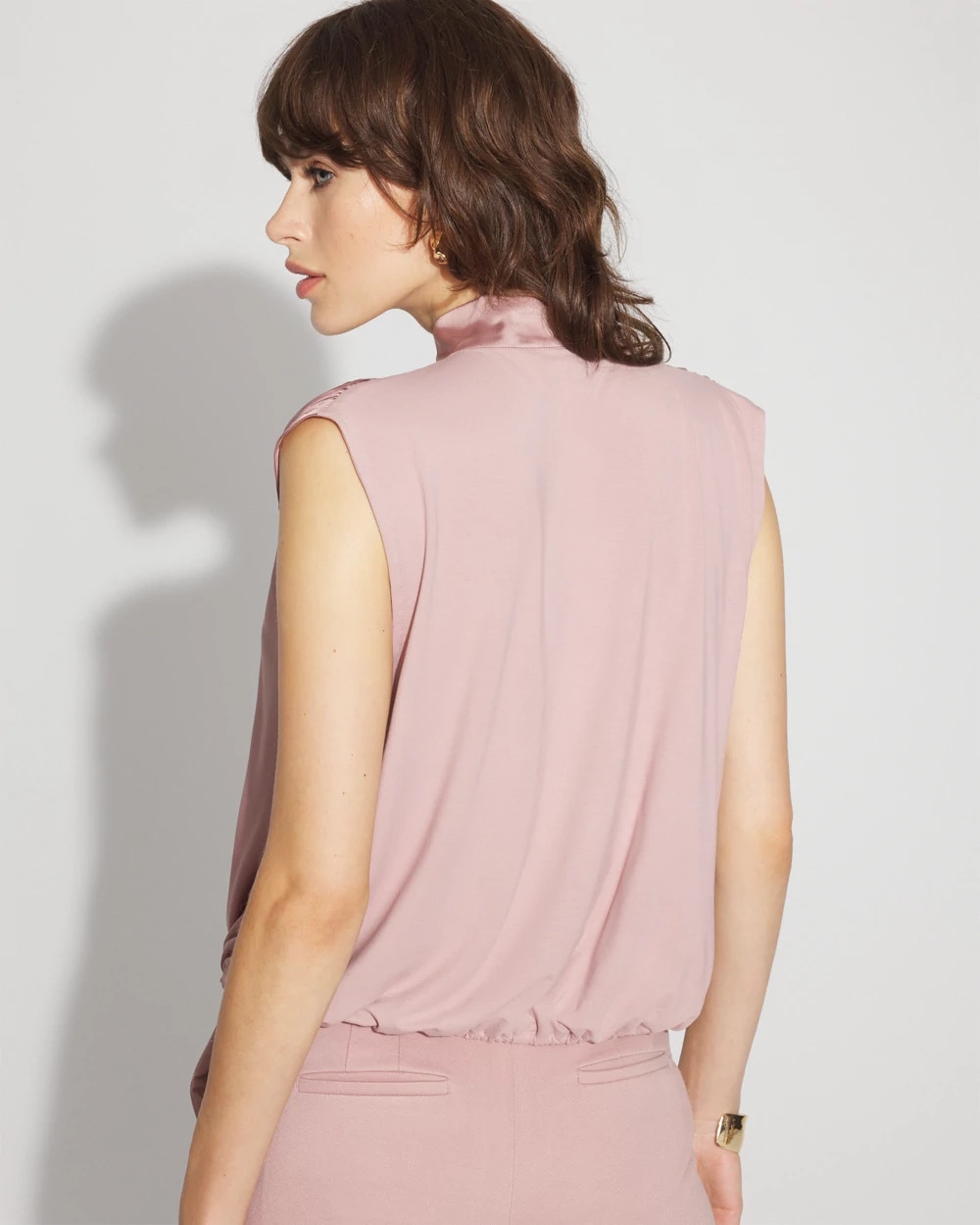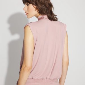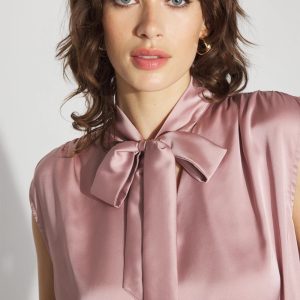 This stylish shell will quickly become a workwear favorite. Designed with soft shirring at the shoulders, it has a gathered hem to create a “bubble” silhouette. The ties at the neckline give you styling options. Layer under a blazer and pair with your favorite black pant.