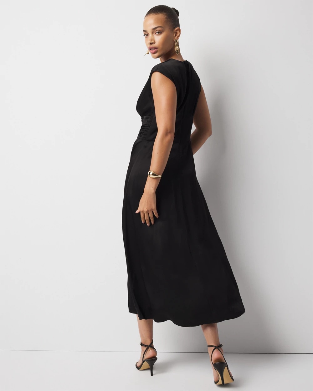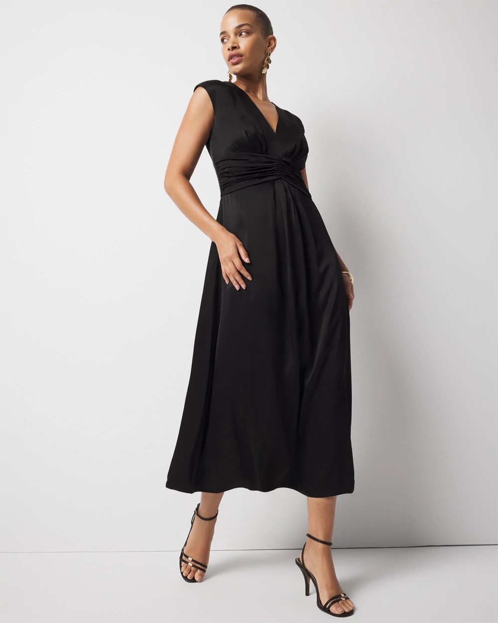 A soft satin dress with a defining shirred band across the waist and A-line skirt. A self-covered button keyhole and center back zipper gets you in and out. An elevated timeless look for your social calendar.