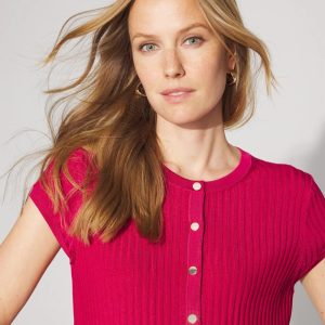 Knitted from space-dyed yarn to create a multi-colored pattern, this cap sleeve cardi has a grosgrain placket and soft gold snaps for closure. Try it with the matching Space-Dyed Tank Top.
