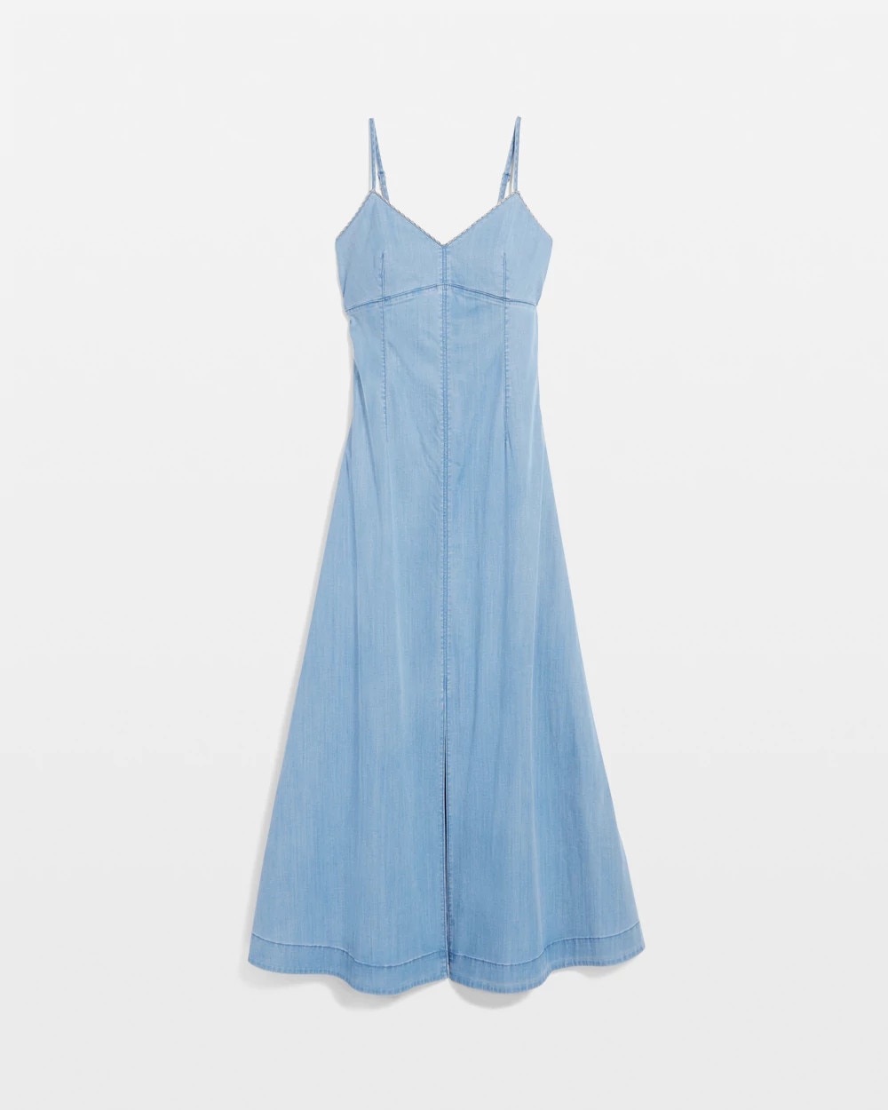 Metal chain trim along the neckline elevates this classic denim maxi dress. Seam details and front slit finish the look. A wardrobe essential that can be dressed up or down, think long weekend barbecue or date night.