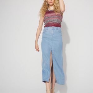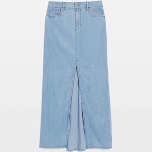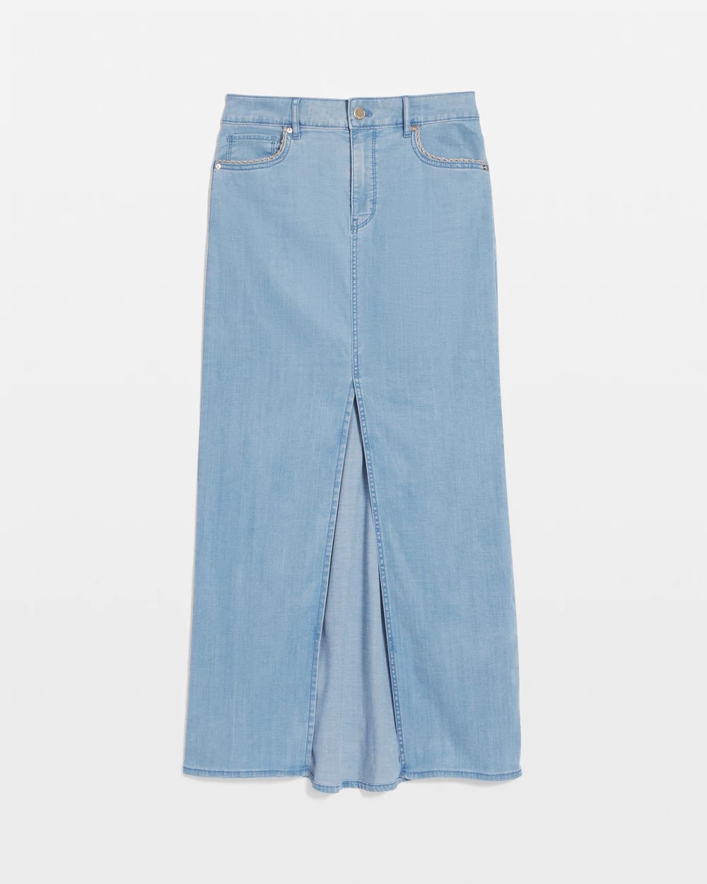 Crafted from soft, lightweight Tencel, this A-line maxi skirt is designed with chain trimmed pockets. A front slit and Godet pleat in back give the skirt a flattering flare shape.