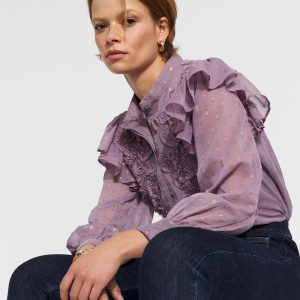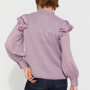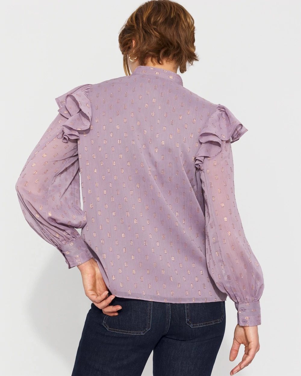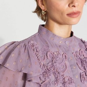Cue the romance with this feminine blouse that’s designed with delicate ruffles at the shoulder, intricate floral appliqué + beading and an allover metallic clip. This blouse will instantly elevate your jeans or pants.