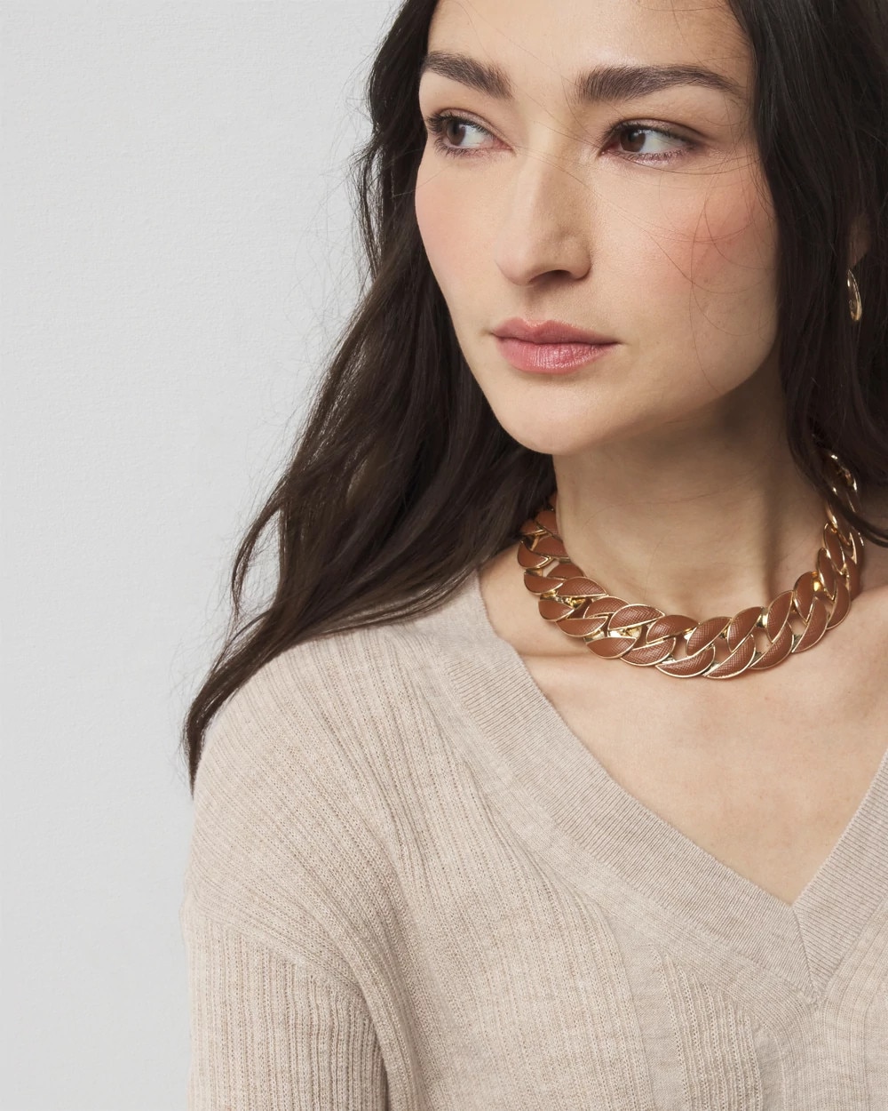 This statement necklace is fashioned from brown saffiano leather links to create a stunning look that is modern and elevated. Pair with other pieces from our Textured Inlay Collection.