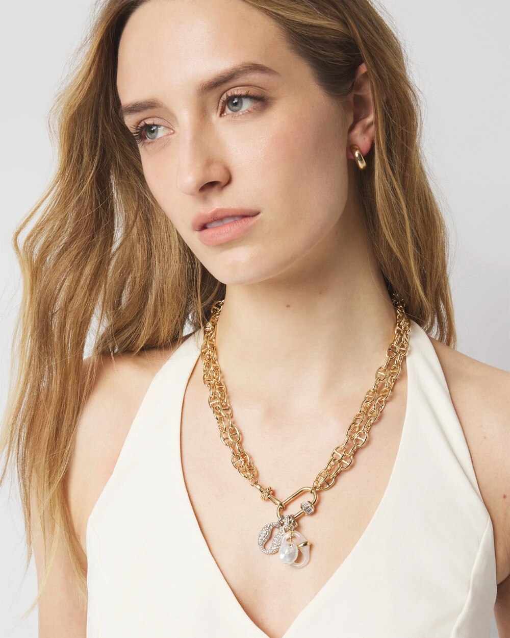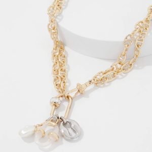 Two mariner link charms and a faux pearl dangle delicately at the end of the gold tone convertible necklace. Wear it at the shorter length with your favorite top or lengthen it and pair with your summer dresses. Mix and match with other pieces in our Mariner Links Collection.
