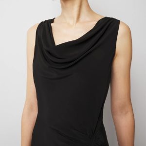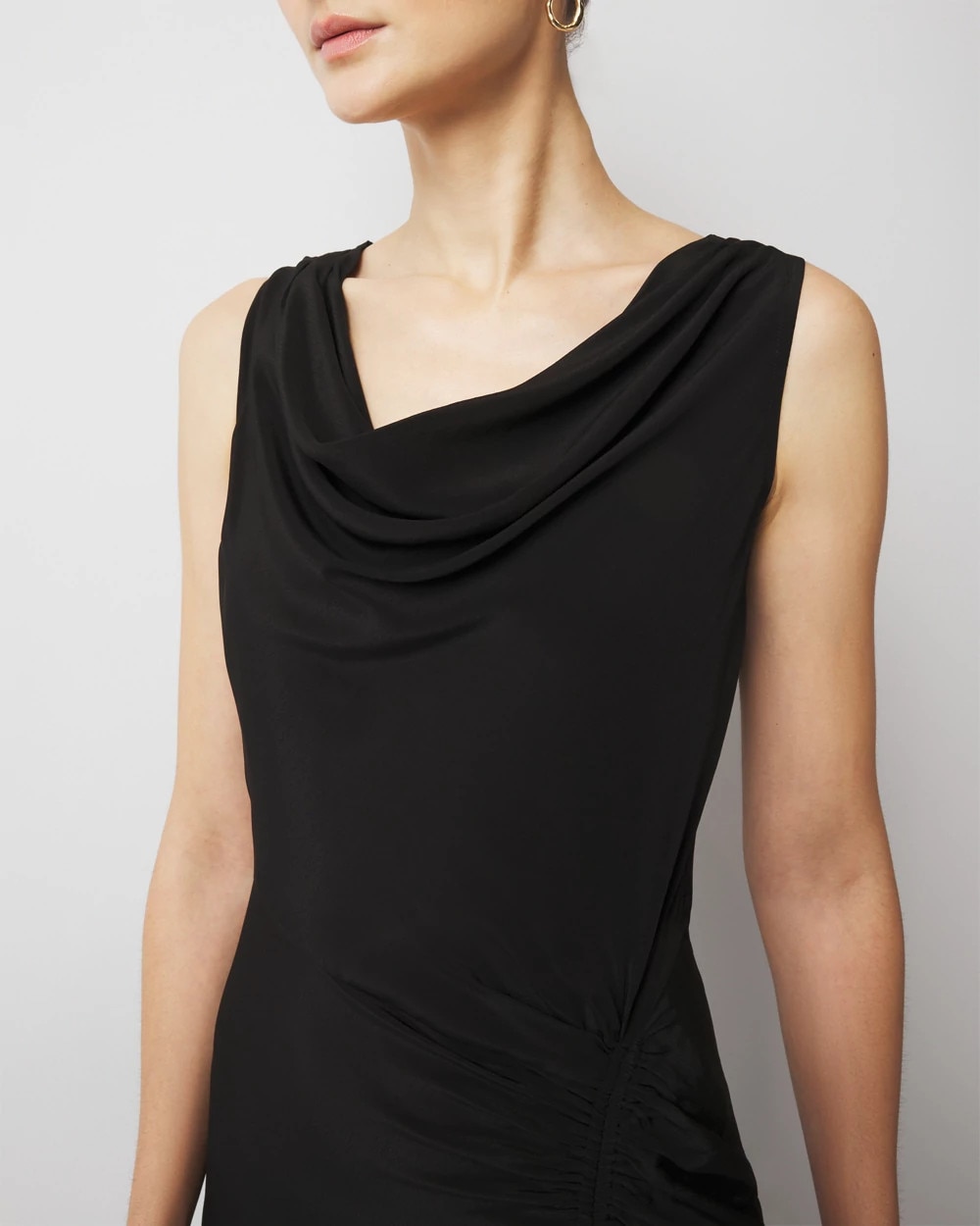 This timeless dress has a cowl neckline and ruching on one hip above a slight slit. Flirty, feminine and easy to style with jewelry and heels,
