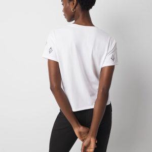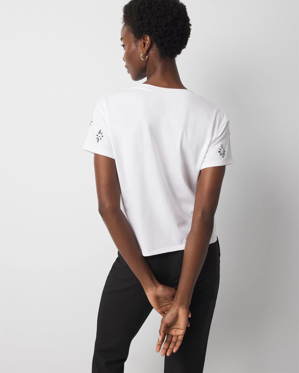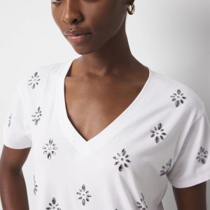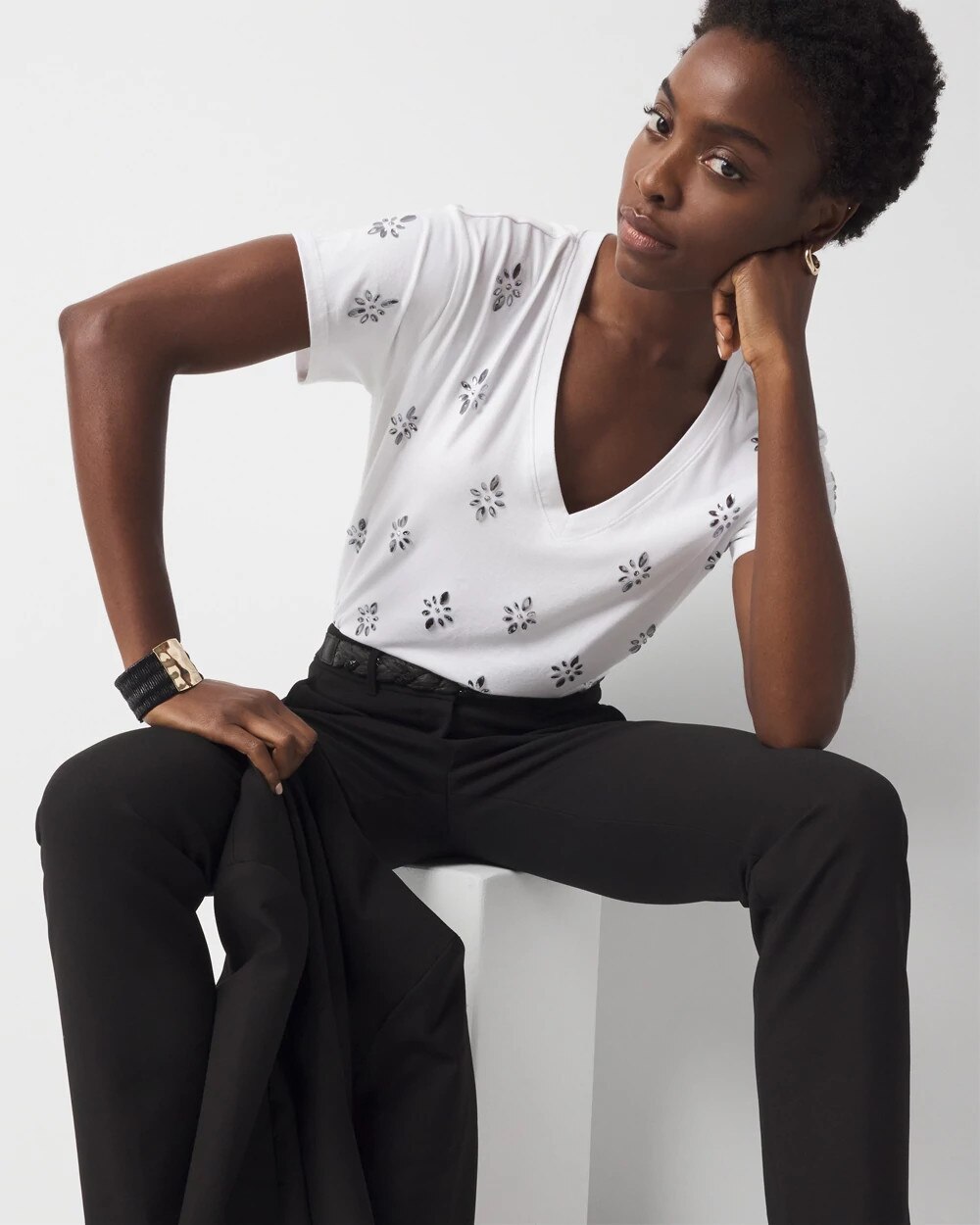 Add sparkle to summer nights with this short-sleeve V-neck tee that’s embellished with diamond patterned crystals. Pair with any denim or shorts for added bling.