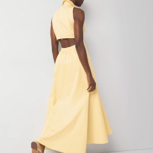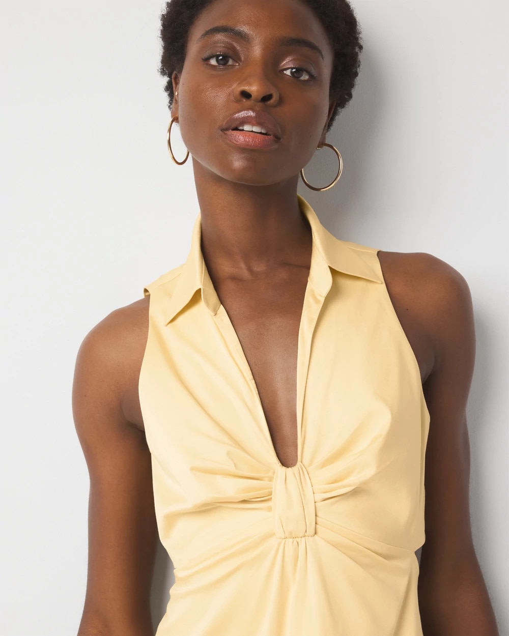 This easy on the eyes summer dress has a shirt collar and knot at the bust for a halter top look. The cut-out at the waist exposed a sliver of your back. A great look for summer parties.