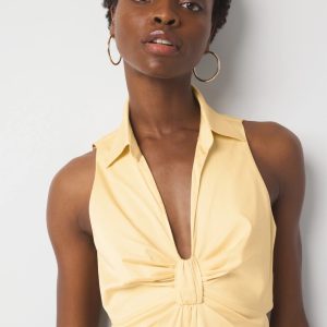 This easy on the eyes summer dress has a shirt collar and knot at the bust for a halter top look. The cut-out at the waist exposed a sliver of your back. A great look for summer parties.