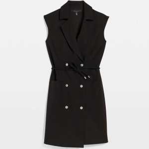 An above the knee work look that takes inspo from a double-breasted blazer. Designed with notched lapels and crest buttons, this dress has non-functioning welt pockets and a cord-tie belt that you can remove or tie as you wish. The shoulder pads add a fashion silhouette but are removable.
