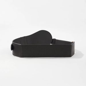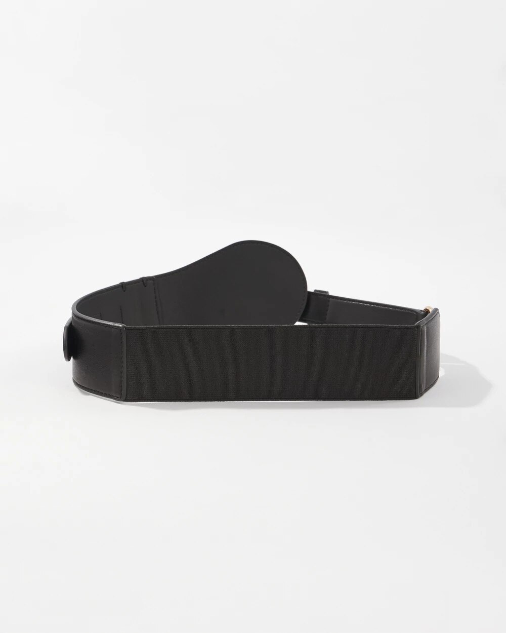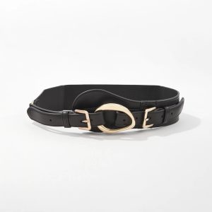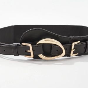 Two gold sculptural buckles elevate this wide belt that will add flair to dresses and define your waist. Made from faux leather.