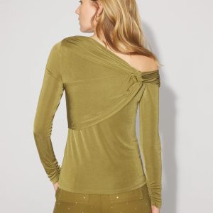 Crafted from a “luster” jersey knit fabric that has a chic sheen to it, this top is designed with draping across the shoulder and bust, with a twist detail at the neckline. A sleek going-out top to pair with jeans and pants.