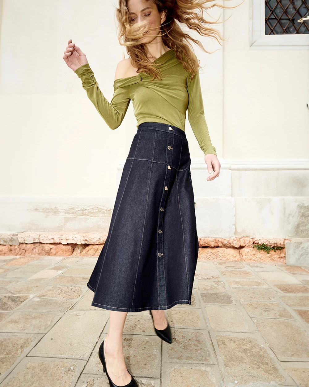 Drop Waist Denim A-Line Midi Skirt