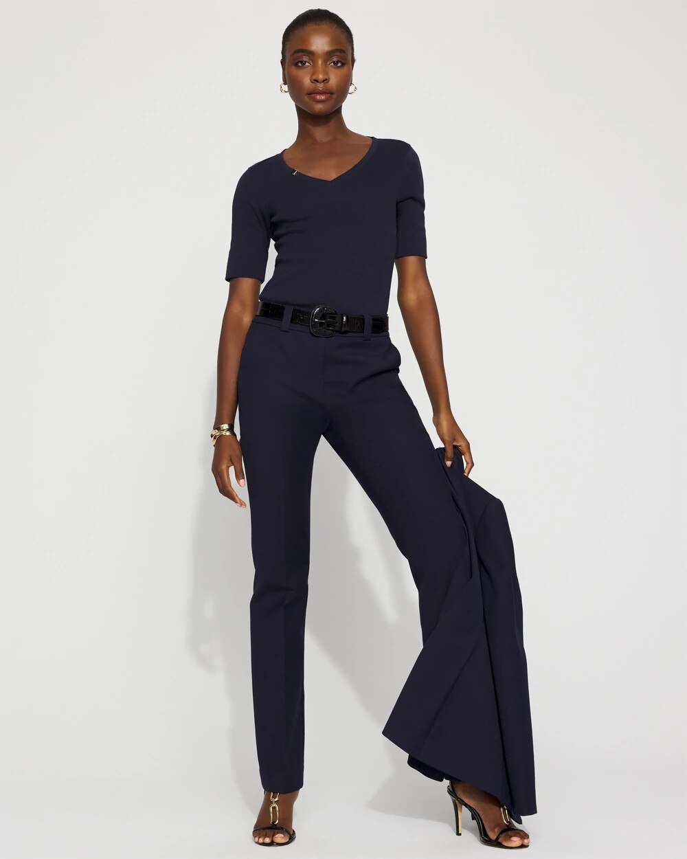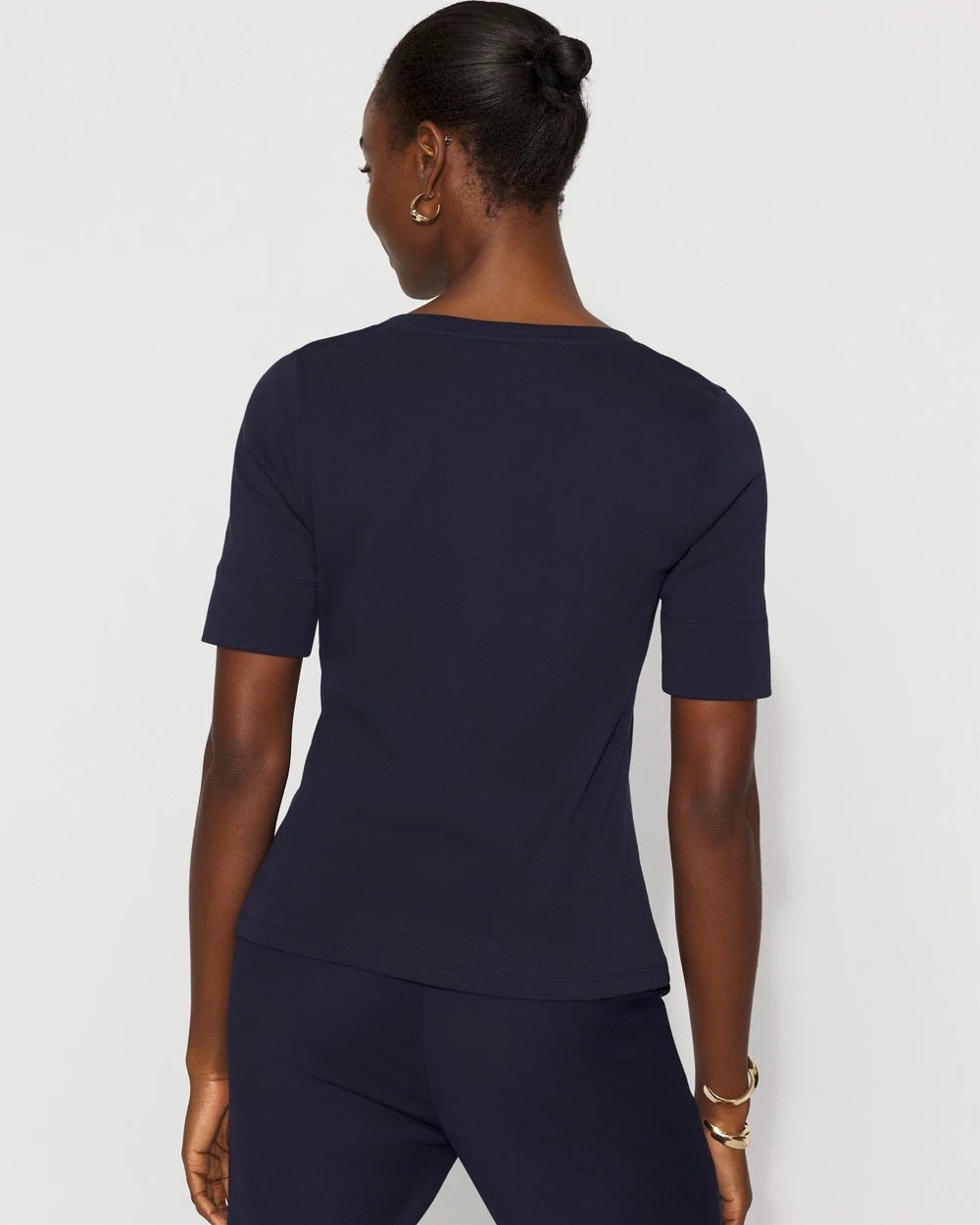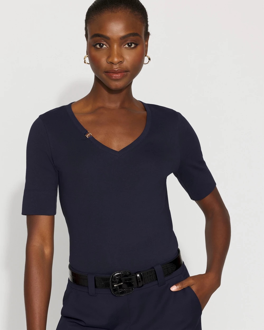 We added a charm to the V-neckline of this cotton tee for a subtle + stylish touch. The elbow sleeve is the perfect amount of arm coverage too.
