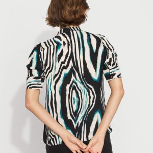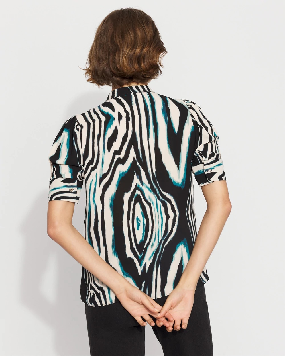 A simple + stylish shirt for work, it is designed with elbow sleeves, a Y-neckline and shirt cuffs. Wear it with your favorite black pant.