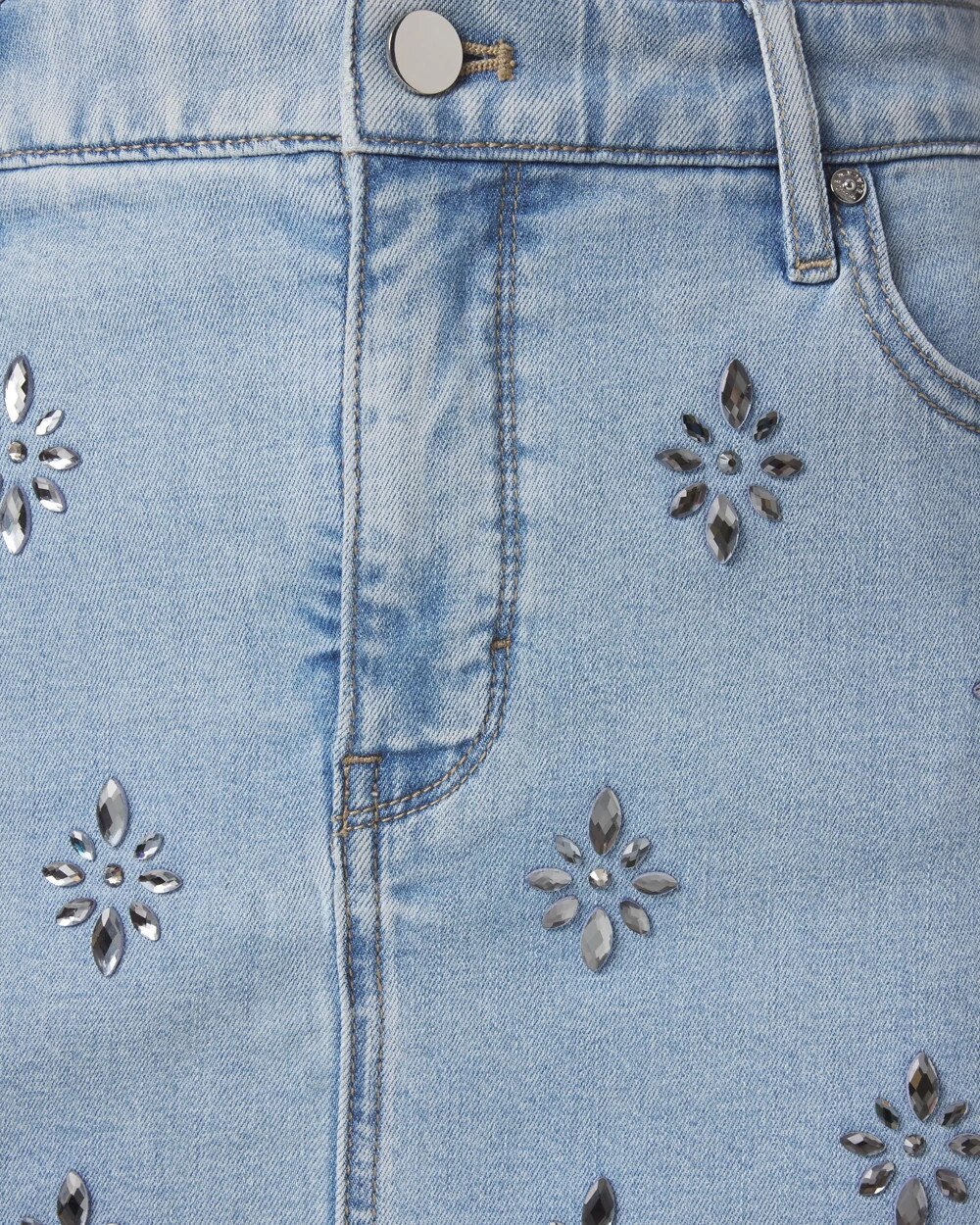 This classic denim mini skirt has diamond shaped embellishment down the front for subtle summer bling. A cute look for strappy sandals or dress it down with sneakers.
