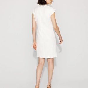 This mini shift dress has a mod vibe that’s very of the moment. We crafted this one from a tweed fabric and added a crystal embellished neckline. A sexy + polished look for a night out. Pair with heels or boots.