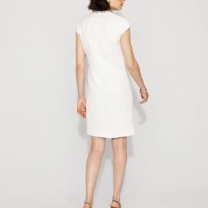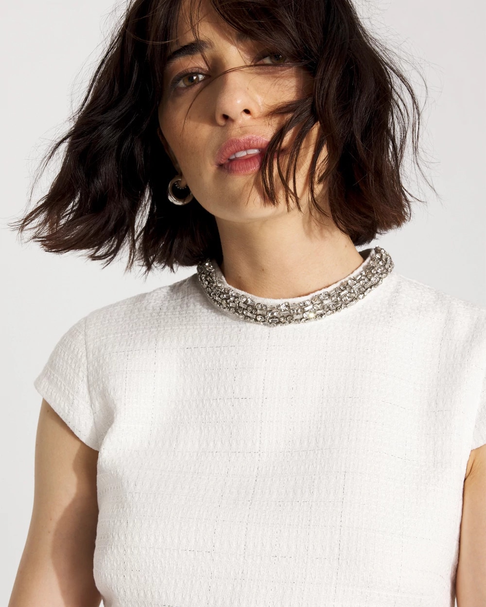 This mini shift dress has a mod vibe that’s very of the moment. We crafted this one from a tweed fabric and added a crystal embellished neckline. A sexy + polished look for a night out. Pair with heels or boots.