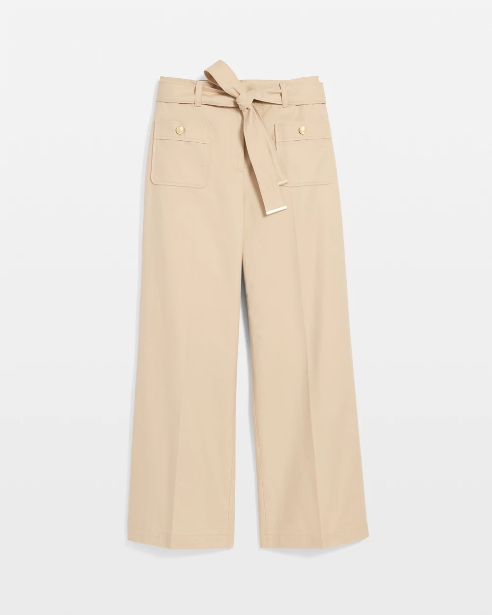 Reach for these wide-leg crops when you want a casual pant for everyday errands or outings. Designed with patch pockets in front and back and a removable belt with soft gold trim. Crest buttons on the front pockets add flair. The fabric is a cotton blend for a slightly stiff feel that holds its shape.