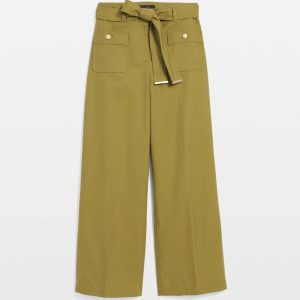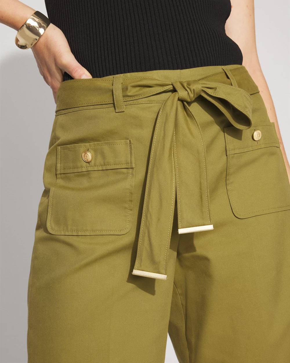 Reach for these wide-leg crops when you want a casual pant for everyday errands or outings. Designed with patch pockets in front and back and a removable belt with soft gold trim. Crest buttons on the front pockets add flair. The fabric is a cotton blend for a slightly stiff feel that holds its shape.