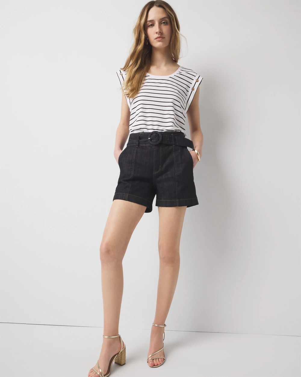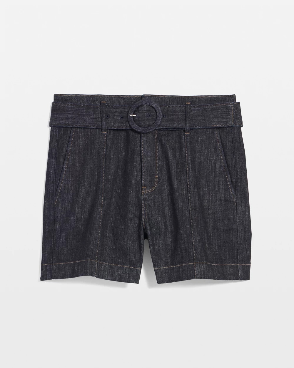 These dark wash denim shorts have a polished look thanks for trouser pockets in front and back and a wide self-belt. Wear to the office if you dare or do weekend jaunts in style.