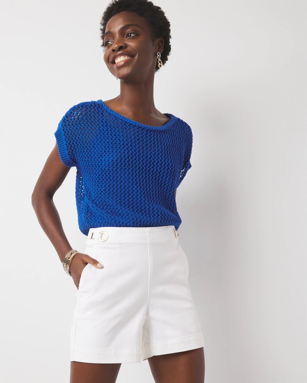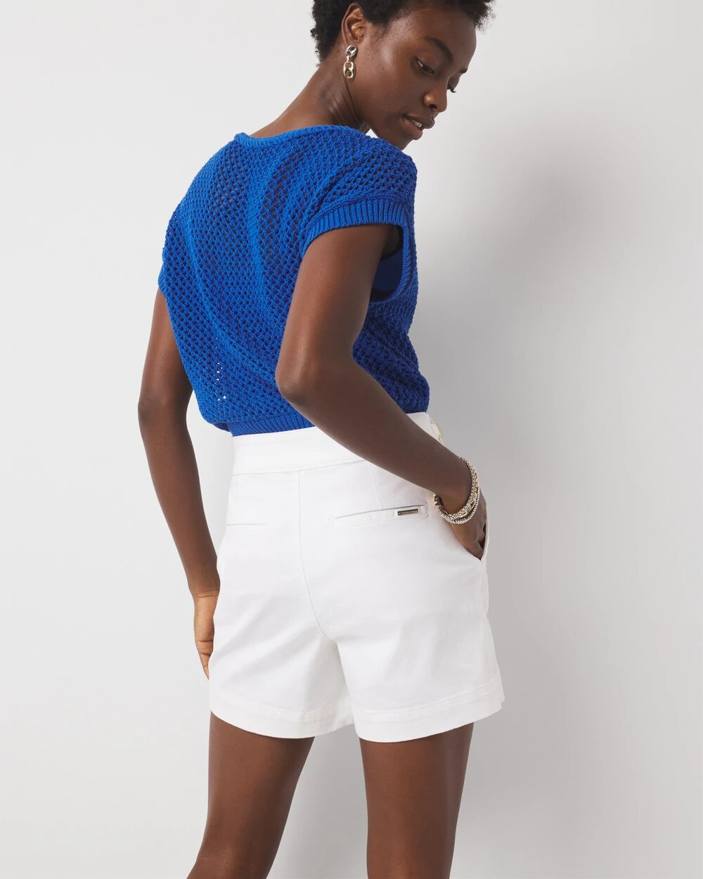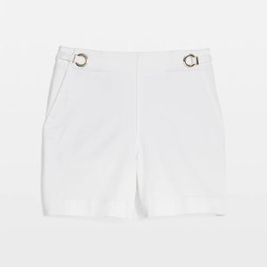White denim is big this season. And the grommet and tab details set these extra high-rise denim shorts apart. Front slash pockets and back welt pockets also give you a streamlined look.
