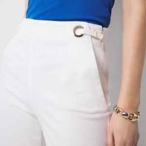 What’s summer without white jeans? This pair has grommet and tab details on the waistband, front slash pockets, back welt pockets and seaming on the cuffs, the result is a modern + polished wide leg jean.