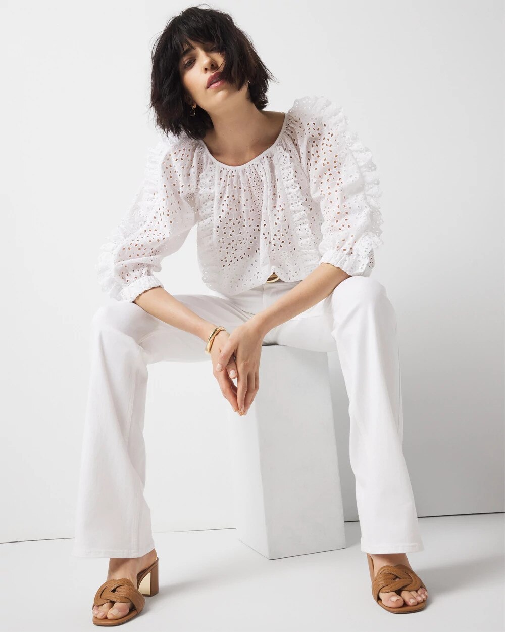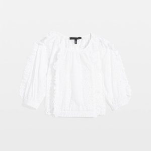 Strike a feminine note with this 100% cotton eyelet blouse. We’ve added ruffles at the princess seams and on the sleeves for a touch of drama, and an elastic hem for a cinched affect. There is a back keyhole with a button for closure. Pair with jeans or shorts and heels. This blouse is sheer, and we recommend wearing a WHBM FORME™ cami or tank top underneath.