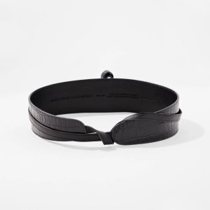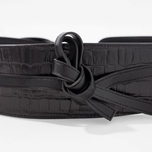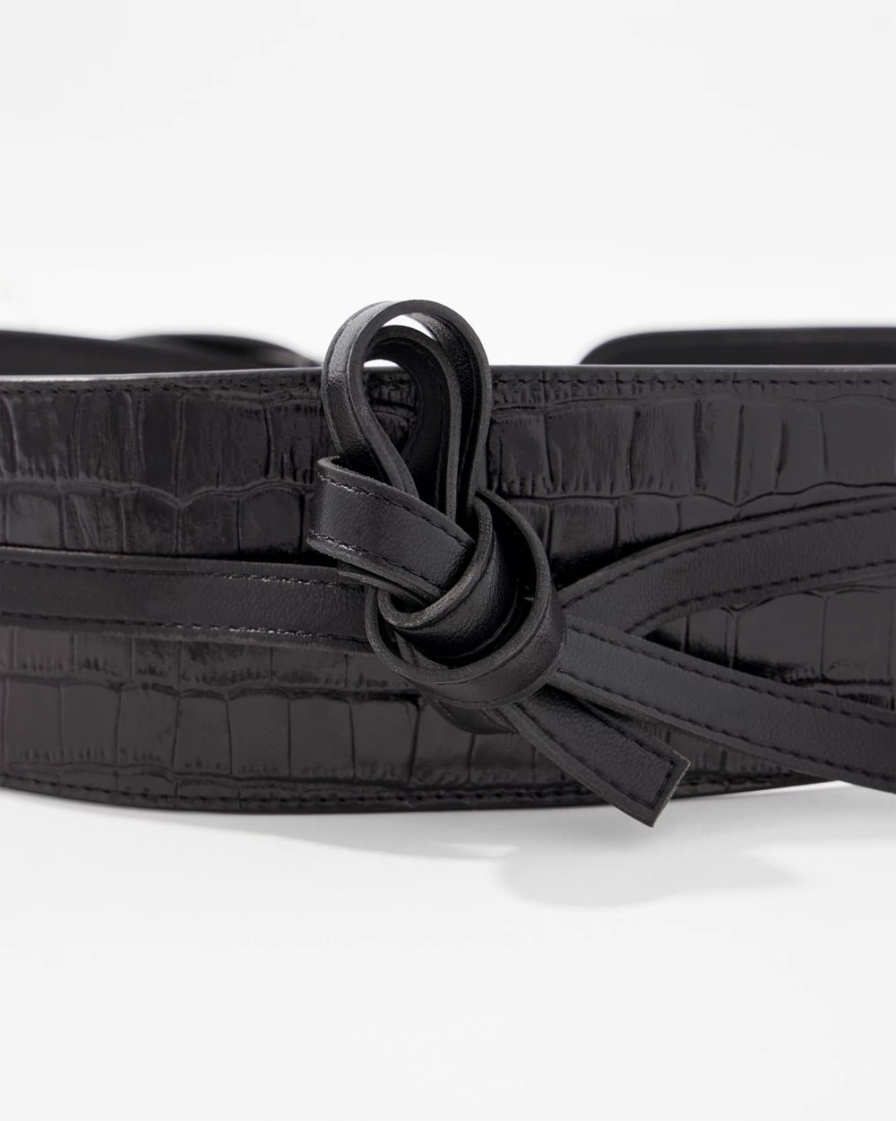 Made with faux leather embossed with a crocodile texture, this obi belt is a must for sweater dresses. Wear it with our coordinating Faux Crocodile Riding Boot and Capped Toe Faux Croc Slingback.