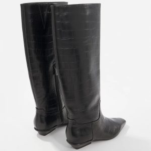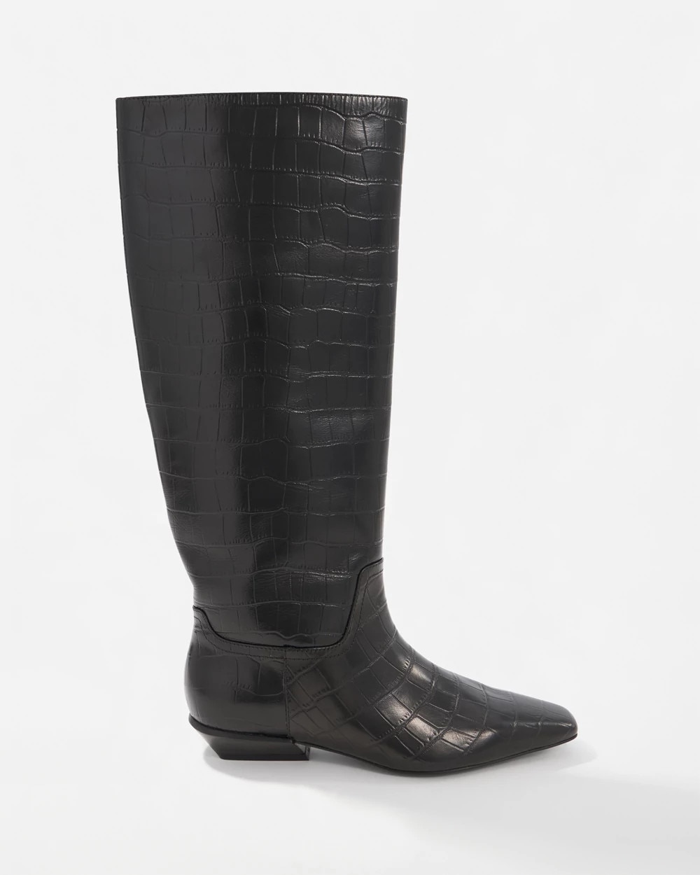 Made from genuine leather with an embossed crocodile texture, this straight, tall boot evokes classic equestrian style. Wear with leggings, skinny jeans or skirts.