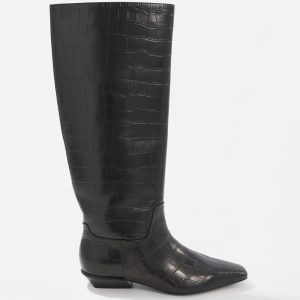 Made from genuine leather with an embossed crocodile texture, this straight, tall boot evokes classic equestrian style. Wear with leggings, skinny jeans or skirts.